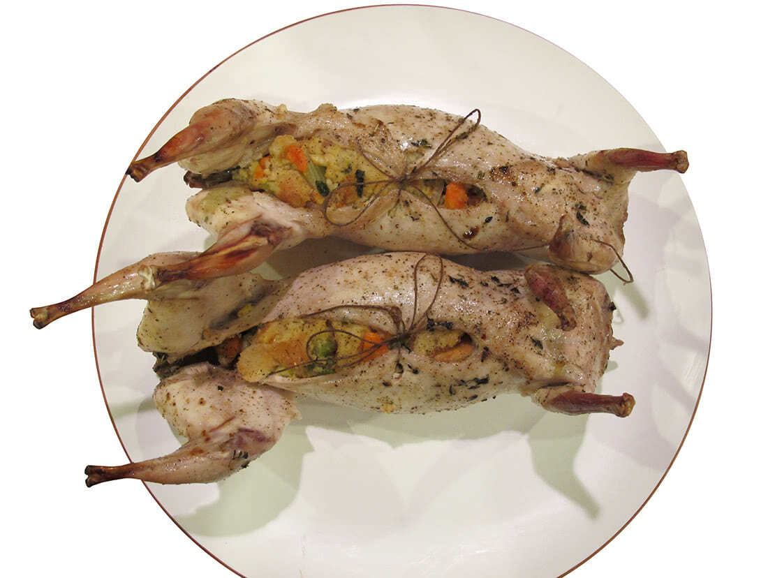 Кролика обработать и тщательно промыть. Задний окорок без кости слегка отбить, посолить, поперчить. Нарезать морковь, сваренное вкрутую яйцо. На приготовленное мясо выложить морковь и яйцо, разровнять, затем свернуть в виде рулета, перевязать ниткой, слегка обжарить и припустить на бульоне. Готовый рулет остудить и нарезать.