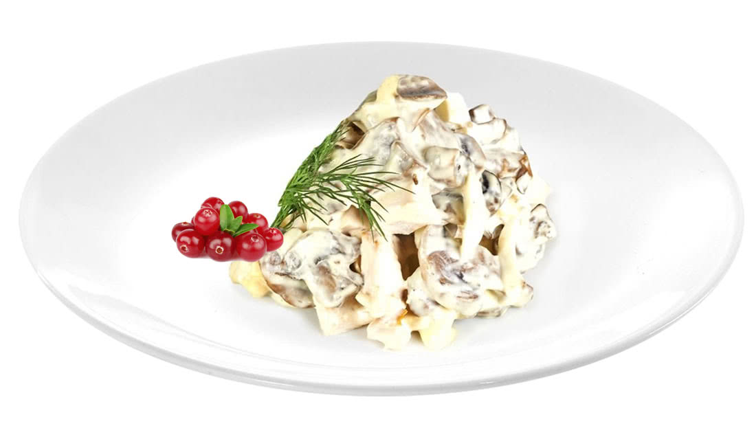 Маринованные или солёные грибы (грузди, рыжики, белые грибы), варёный картофель нарезать дольками, зелёный лук нашинковать. Всё перемешать, заправить салатной заправкой. Уложить в салатник, посыпать зеленью, украсить мелкими грибами и клюквой.