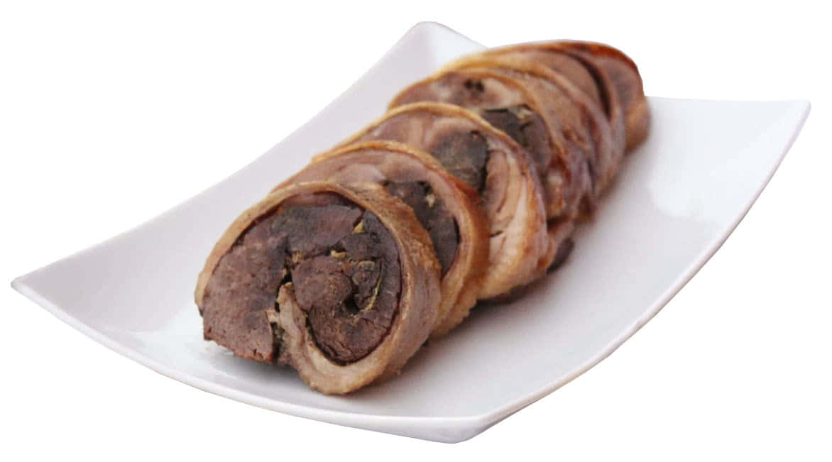 Обработанный рубец свернуть в виде рулета и варить вместе с пряностями и кореньями 4-5 ч. Готовый рубец нарезать поперёк тонкими ломтиками.