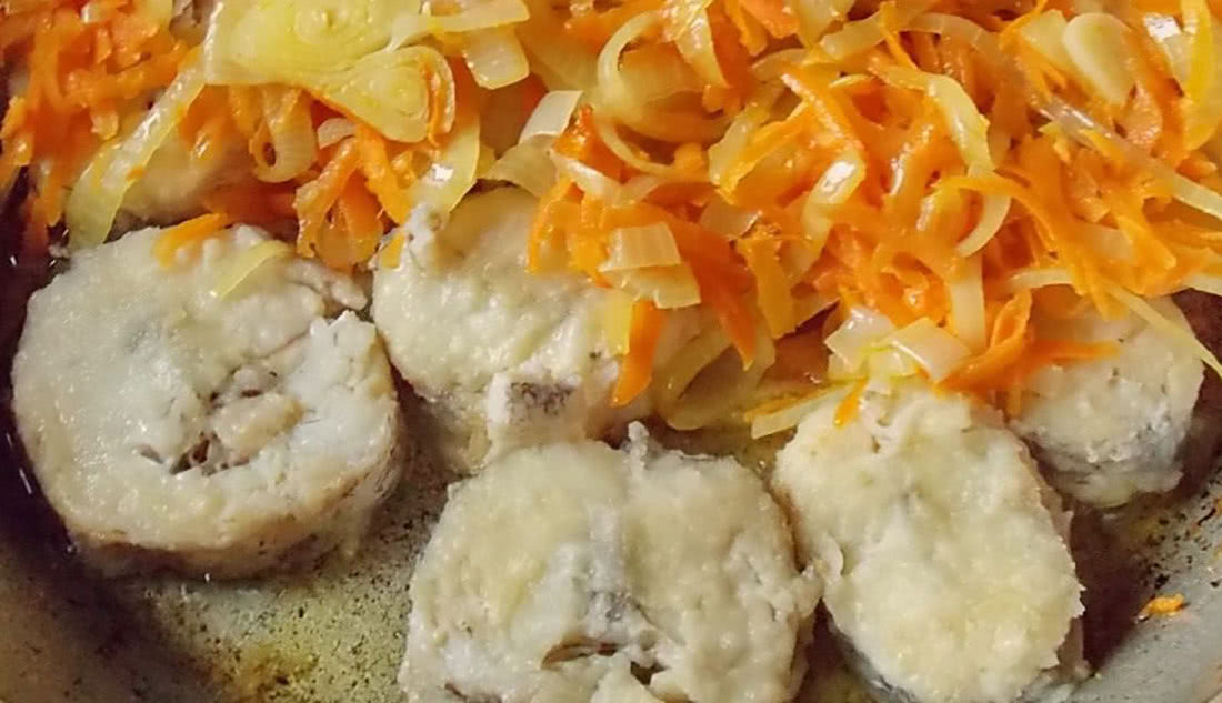Свежемороженую рыбу (слабосолёную или солёную предварительно замочить) промыть, нарезать кусочками, посолить и, обваляв в муке, обжарить на растительном масле, затем поставить на 5 мин в духовку. Готовую рыбу охладить и залить маринадом из овощей с помидорами.
