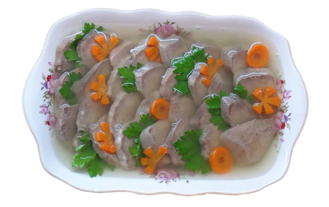 Промытый говяжий язык залить горячей водой и варить 2 ч. За 15 мин до конца варки добавить коренья. Приготовить костный бульон, процедить и, помешивая, ввести в него распущенный желатин. Не доводя до кипения, снять с огня.