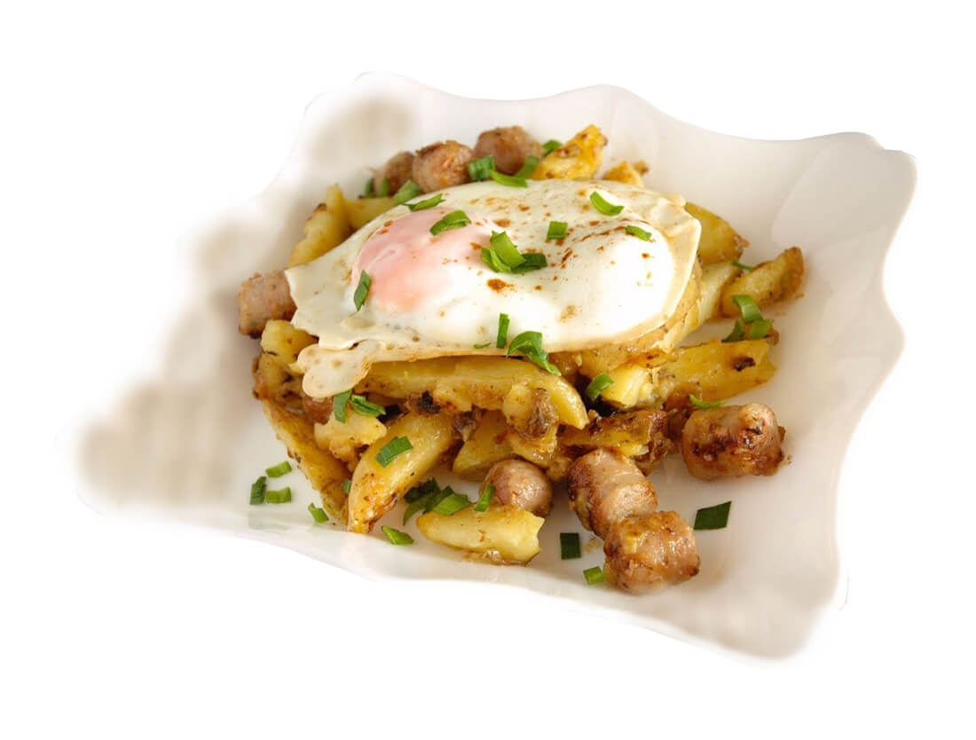 Картофель обжарить, добавить нашинкованный репчатый лук. Яйцо разбить в тарелку, добавить молоко и, перемешав, залить картофель, поставить в печь для запекания на 3-4 мин.