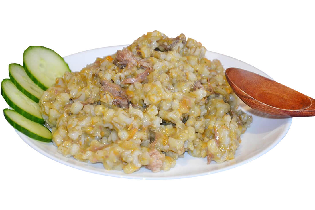 Промытую ячневую или перловую крупу ввести в бульон, сваренный из гусятины. Когда каша загустеет, станет мягкой, добавить пассерованный: лук; соединить всё вместе и перемешать. Готовая каша должна быть нежной, хорошо разварившейся. Мясо подаётся отдельно.