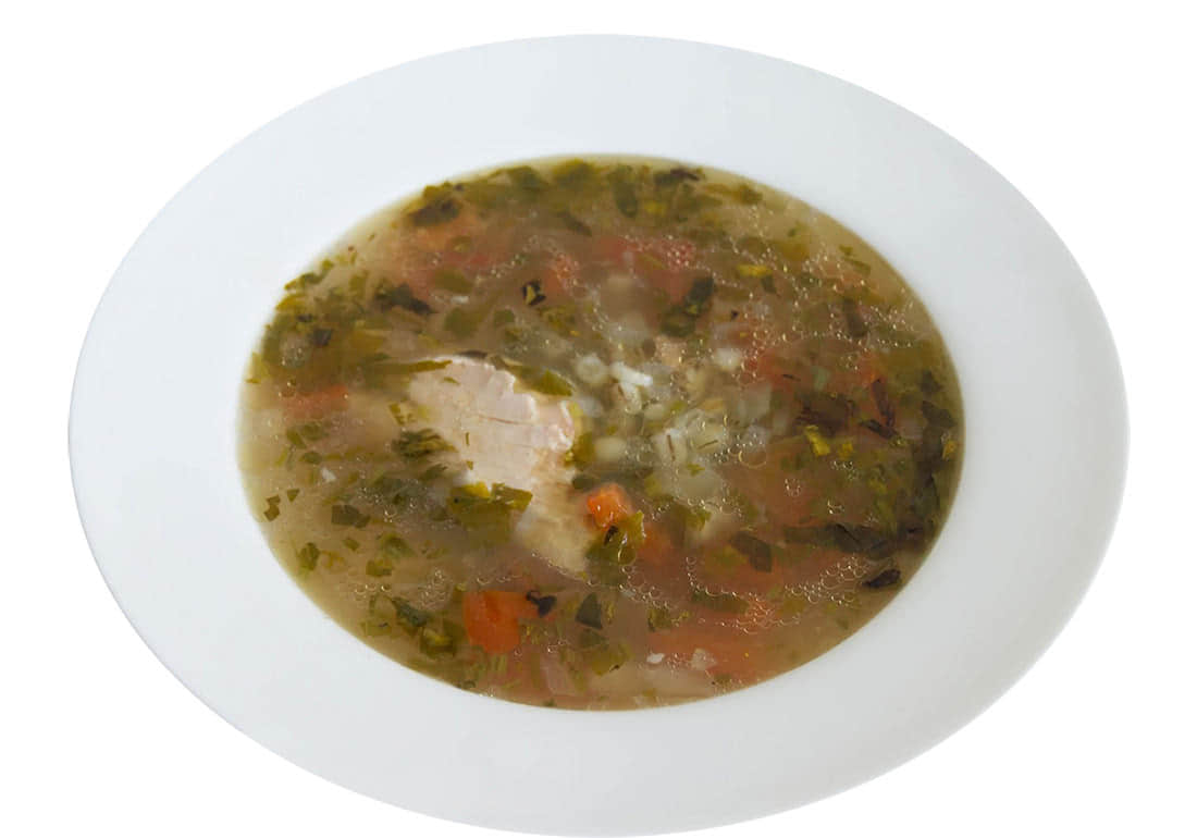 Приготовить мясо-костный бульон. Солёные помидоры или огурцы нашинковать, тушить с добавлением жира и бульона. Морковь, петрушку и лук пассеровать отдельно. В готовый процеженный бульон опустить овсяную или перловую крупу. Когда крупа будет по- луготовой, ввести картофель, нарезанный дольками, свежую капусту, в конце варки — тушёные огурцы или помидоры, затем — пассеровку и чеснок. Вкус супа должен быть острым, цвет — слегка зеленоватым.