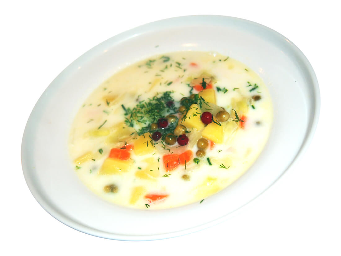 Очистить и промыть овощи, цветную капусту разобрать на соцветия, картофель нарезать брусочками, репу, морковь слегка спассеровать в масле. В кастрюлю с горячей водой опустить картофель, цветную капусту, пассерованные овощи и дать прокипеть 20 мин, после чего ввести кипячёное молоко, всё прокипятить ещё раз и довести до вкуса.