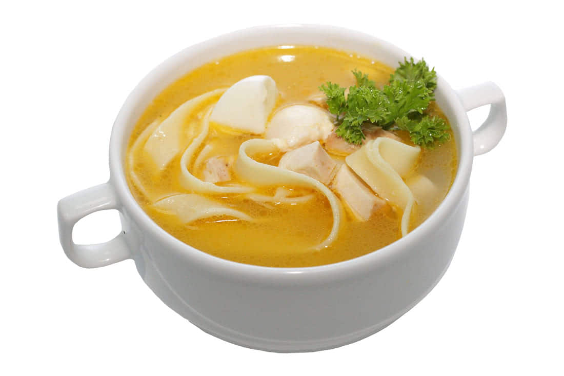Приготовить куриный или мясной бульон, можно и грибной. Для лапши взять просеянную пшеничную муку. Муку высыпать холмиком, сделать углубление, ввести яйцо, соль, холодную воду и замесить крутое вязкое тесто. Готовое тесто раскатать лепёшкой толщиной 1-1,5 мм, посыпать мукой и дать отлежаться 10-15 мин, после чего стряхнуть и подсушить, а затем разрезать на ровные ленты. Ленты-полоски сложить друг на друга и нарезать соломкой. В тесто можно добавить сливочное масло. В кипящий бульон опустить готовую лапшу и пассерованные морковь, петрушку, лук. При подаче посыпать зеленью.