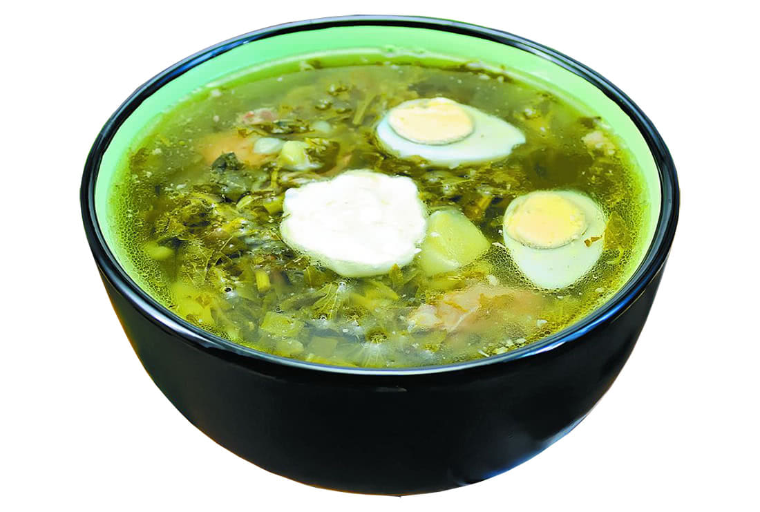В мясной бульон вначале положить нарезанный картофель. Свежую крапиву предварительно перебрать и обдать кипятком. Перед тем как картофель сварится, добавить крапиву, соль, пассерованный лук, перец горошком, влить взбитое яйцо и довести до готовности. Затем добавить другие компоненты.