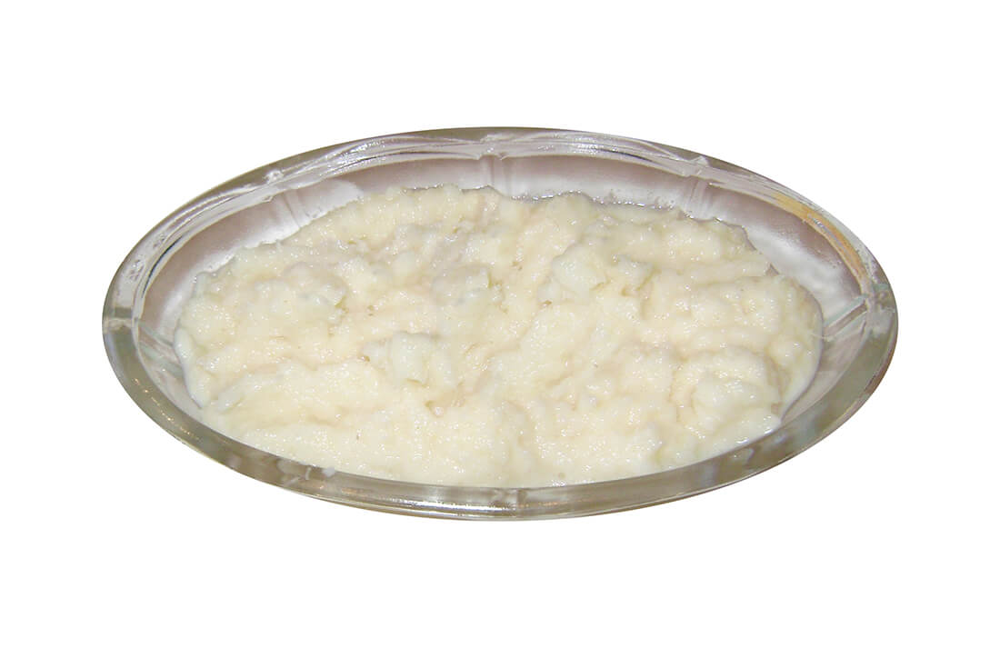 Корень хрена промыть, очистить, натереть на тёрке или пропустить через мясорубку, сложить в фарфоровую или эмалированную посуду, залить кипятком, закрыть крышкой. Затем добавить сахар, уксус, соль и хорошенько размешать.