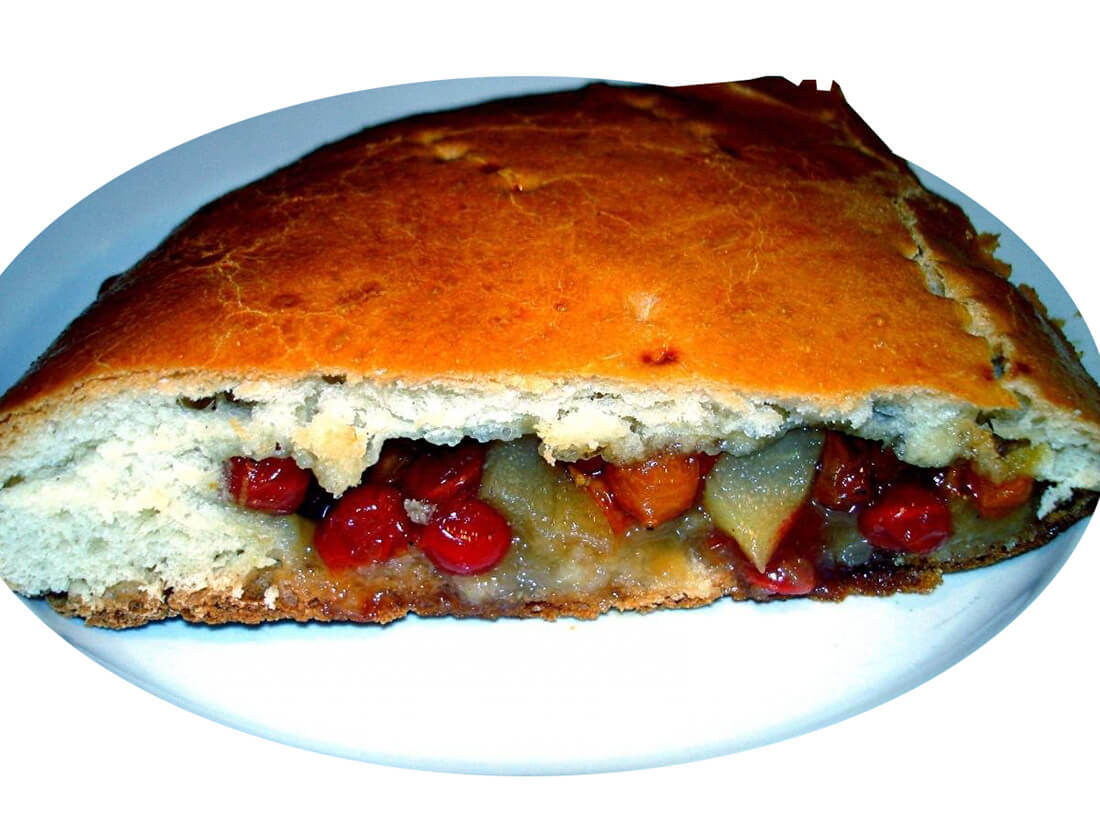 Предварительно отварить рис, говядину пропустить через мясорубку вместе с луком, поджарить, посолить, поперчить. Замочить изюм и рябину. Сдобное дрожжевое тесто раскатать, положить на смазанную маслом сковороду, посыпать тонким слоем тёртого сыра, затем выложить ровным слоем мясо, рис, рубленое яйцо, пассерованный лук, снова мясной фарш, рис и изюм с рябиной.