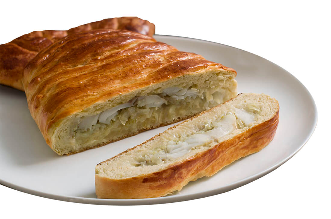 Из опарного теста раскатать сочень и выложить на смазанную сковороду. Сырой, нарезанный кружочками картофель уложить на тесто ровным слоем, на него — нарезанные кусочки рыбы без косточек, сверху — лавровый лист и пассерованный лук, сбрызнуть маслом подсолнечным или льняньщ, закрыть тонко раскатанным тестом, защипать края, дать пирогу подняться и выпекать. Готовый пирог смазать маслом, прикрыть салфеткой.