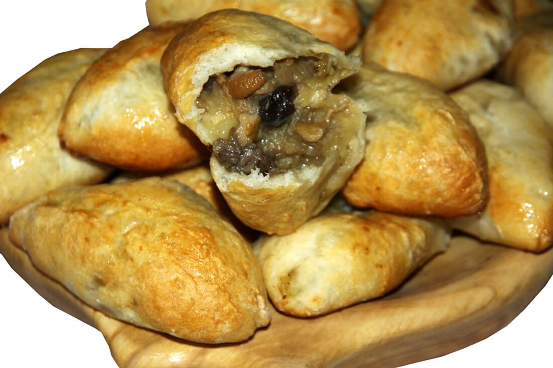 Грибы свежие очистить, промыть, сушёные — перебрать, подержав 3-4 ч в холодной воде, отварить. Затем мелко нарубить или пропустить через мясорубку, соединить с мелко нарезанным луком, посолить, поджарить и довести до вкуса. Опарное тесто разделить на шарики, раскатать в форме лепёшек. На каждую лепёшку положить фарш, загнуть и защипать по краям в виде верёвочки и положить на смазанный лист. На 15-20 мин поставить в тёплое место для подъёма, затем выпекать.