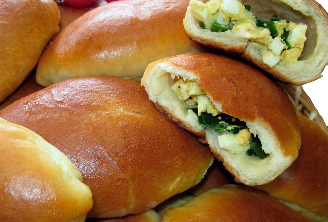 Берётся сдобное тесто. Для начинки зелёный лук очистить, промыть, нарезать не очень мелко и соединить с мелко нарубленными варёными яйцами, посолить, добавить сливочное масло. Делать пирожки так же, как и в предыдущих рецептах.