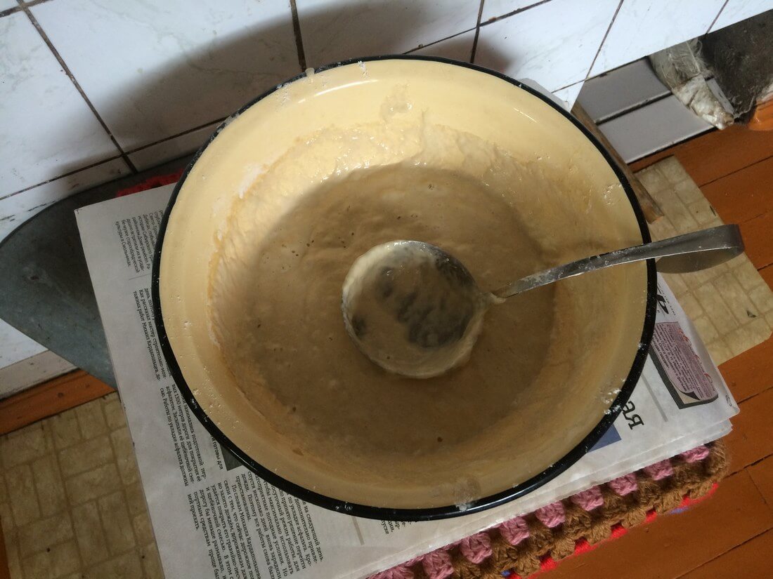 Готовое тесто для табани ставим поближе к печи, чтобы было удобнее накладывать на сковороду.