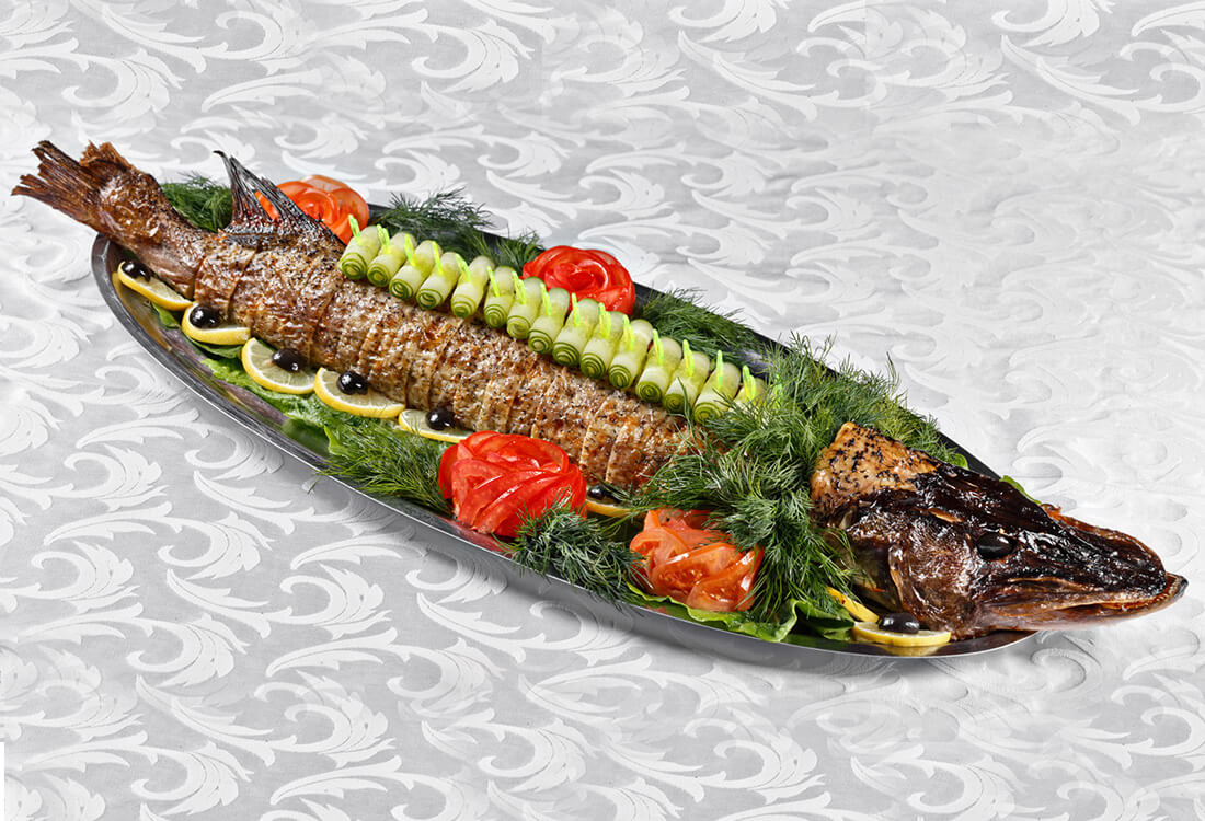 Морковь, петрушку, лук, помидоры, очищенные и промытые, припустить с маслом. Готовую рыбу ошпарить и сложить в сотейник. Добавить сметану, лавровый лист, и, закрыв крышкой, поставить в духовку. Готовую рыбу подавать кусками, украсить овощами, всё посыпать зеленью.
