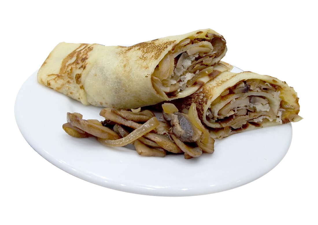 Белые грибы почистить, промыть, мелко нашинковать и обжарить с луком до готовности. Варёный картофель, очищенный и обжаренный, соединить с грибами. Яйцо разбить, добавить молоко, соль и взбить, чтобы получилась однородная масса. Испечь из неё блины. На блины положить фарш из грибов и картофеля, завернуть.
